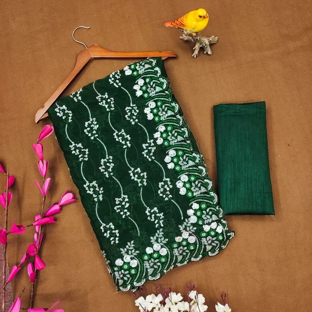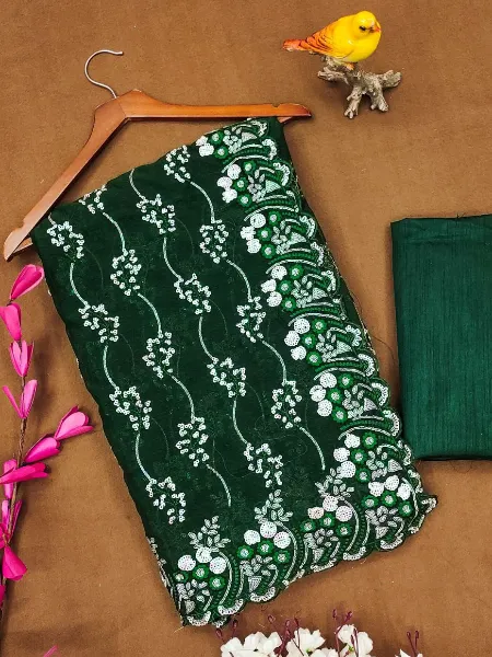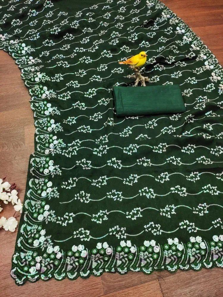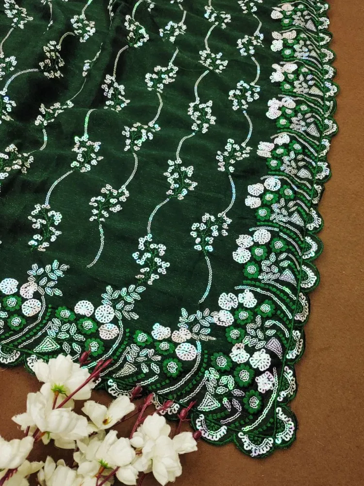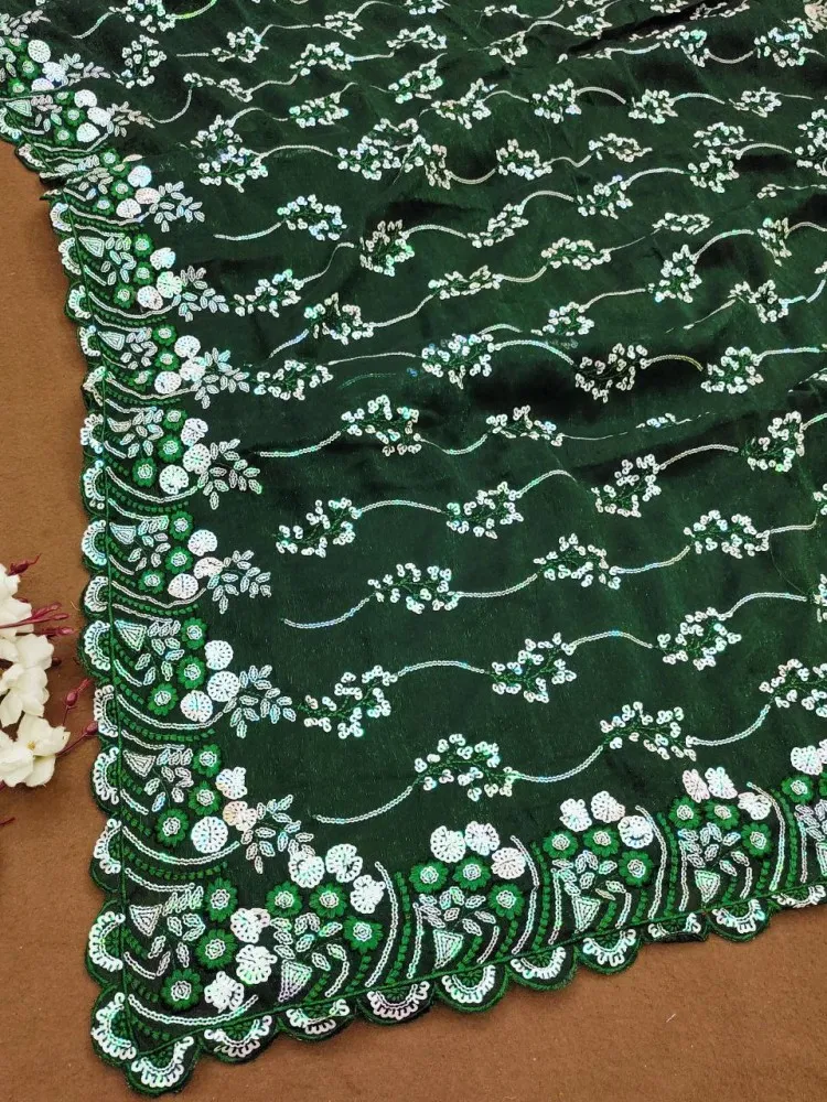 Step into the realm of timeless sophistication with the “Enchanting Fern Glow,” an Indian designer saree meticulously crafted in green simmer Georgette. This exquisite saree is adorned with intricate sequins embroidery, creating a stunning masterpiece that seamlessly blends tradition with contemporary allure.