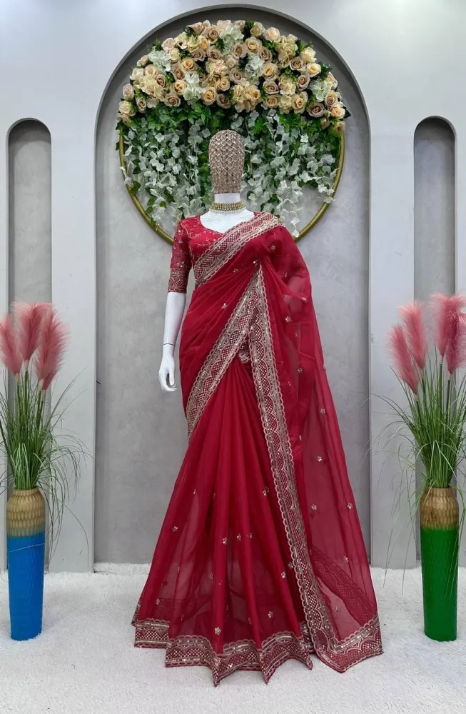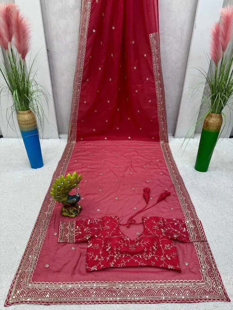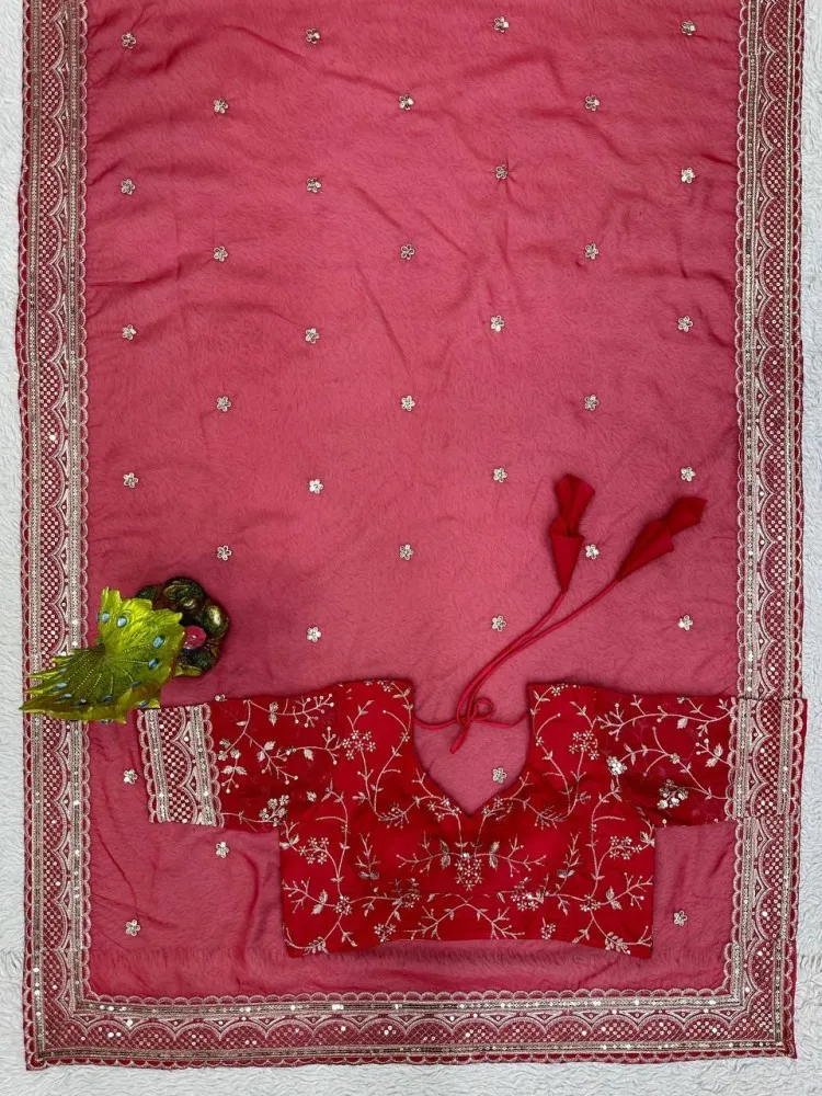 Immerse yourself in refined elegance with our Blush Tabby Silk Saree, featuring exquisite thread sequins embroidery. The luxurious tabby silk fabric in a soft pink hue drapes gracefully, creating a sophisticated and timeless look. This saree is complemented by an elegant matching blouse, making it an ideal choice for festive occasions and celebrations. The detailed embroidery adds a delicate shimmer, ensuring you radiate elegance and charm