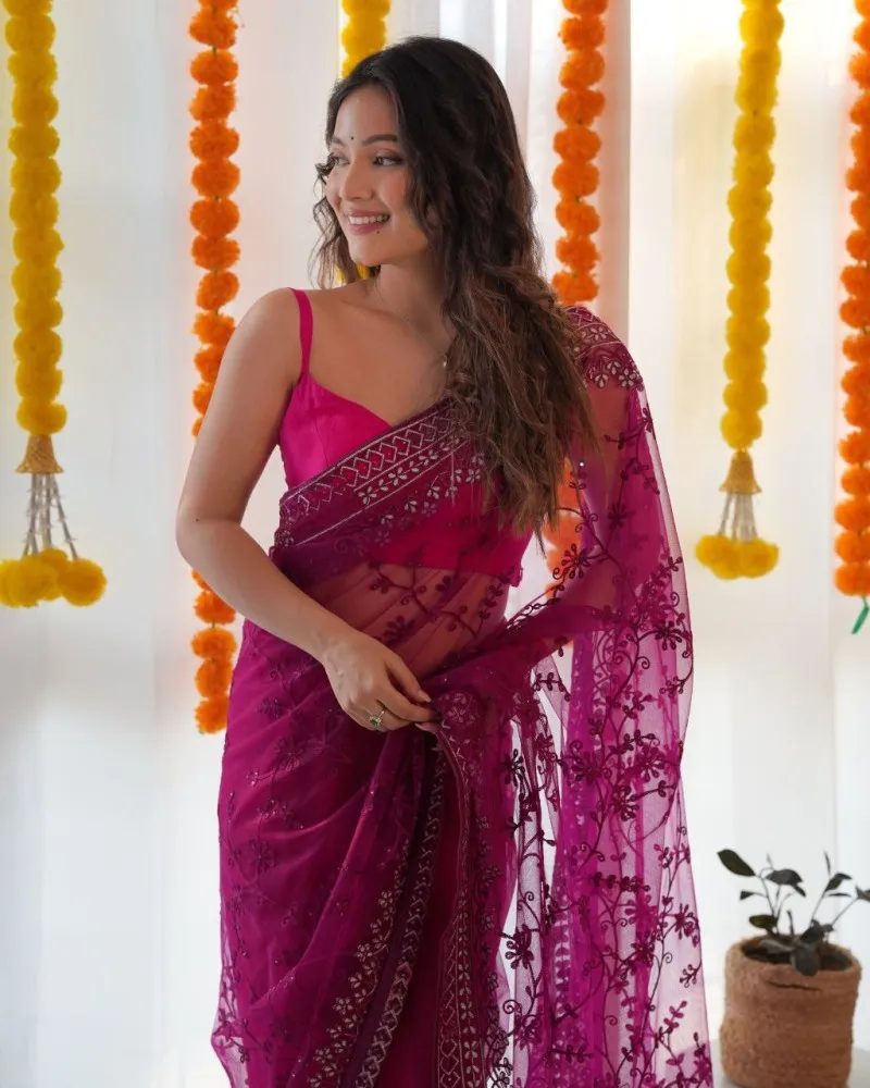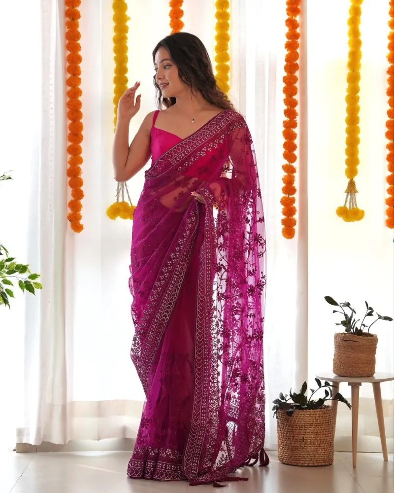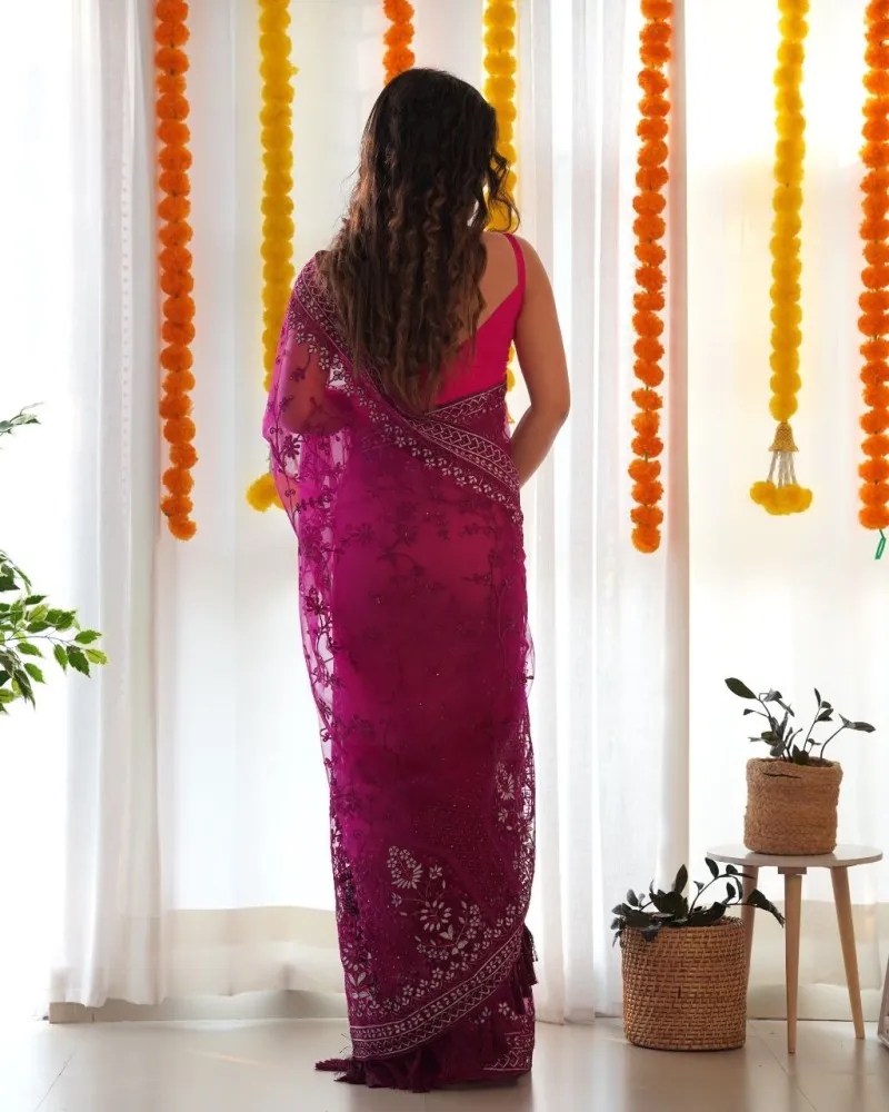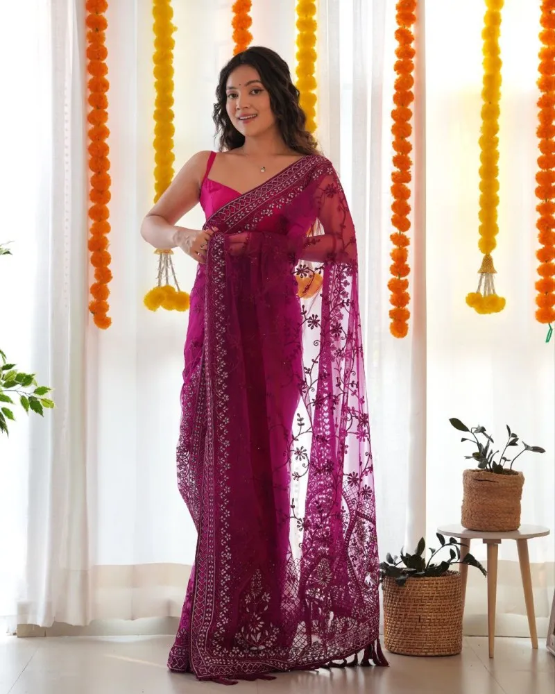 Introducing the “Regal Orchid Elegance” saree, a mesmerizing ensemble crafted in ethereal butterfly net fabric adorned with intricate embroidery and delicate stone accents. The regal purple hue of this saree evokes a sense of sophistication and allure, making it a perfect choice for special occasions.