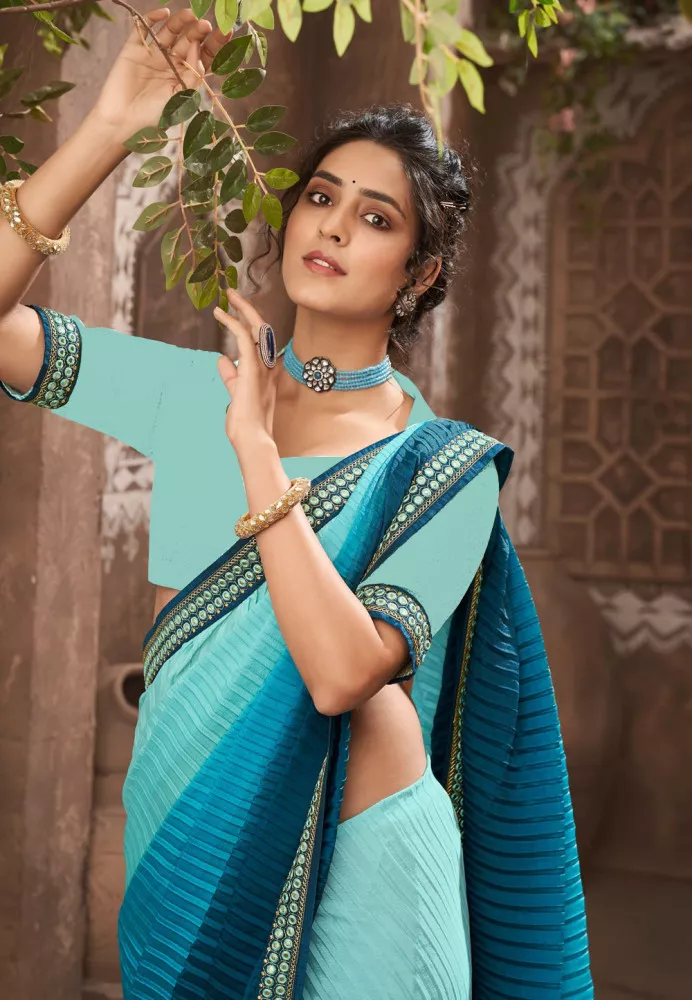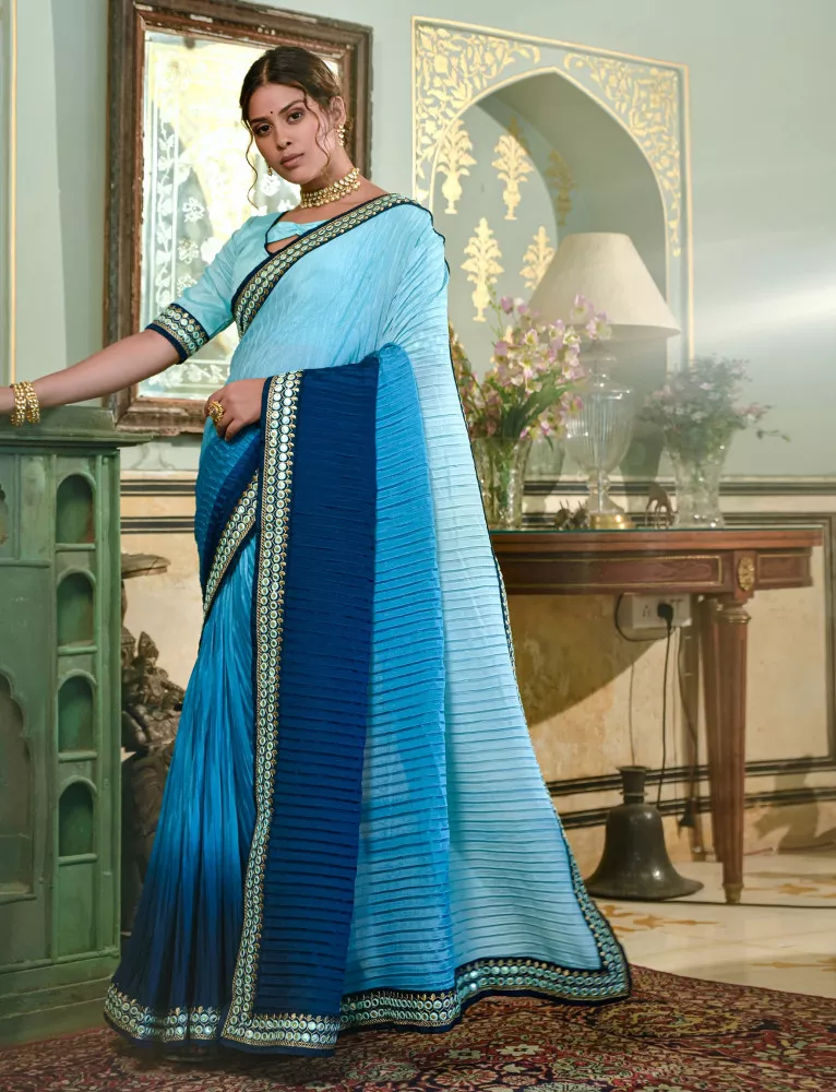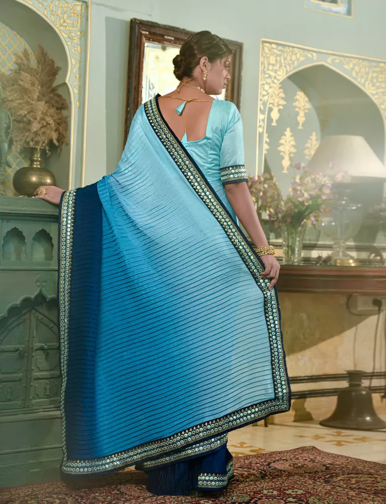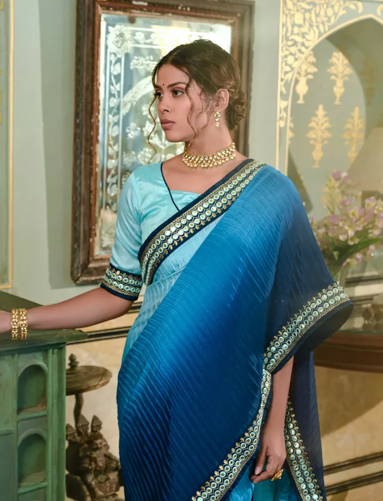 Blue Chinon Saree with Heavy Embroidery Lace Border and Blouse